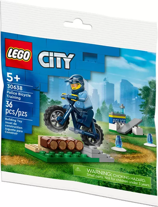 U pakovanju: 1 minifigura policajca, kocke za sastavljanje policijskog bicikla i poligona za obuku, uputstvo za sastavljanje