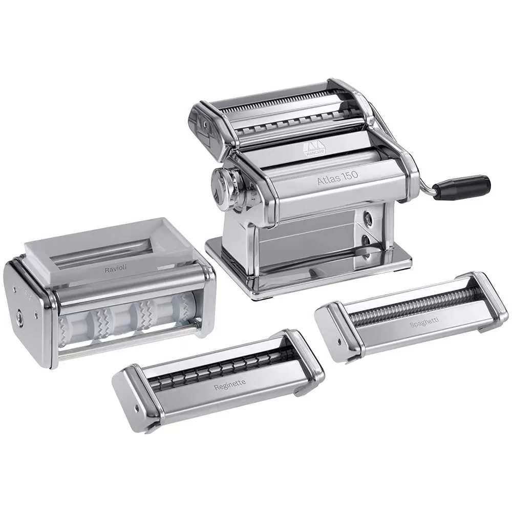 Sadraj pakovanja: mašina Atlas 150 (za tri vrste testenine - listovi lazanje širine 150mm, fetučini - rezanca širine 6.5mm, tagliolini - rezanca širine 1.5 mm), 3 dodatka: za raviole (45x45mm), špagete (2mm)) i reginette (trake širine 12 mm sa cik-cak ivicama)