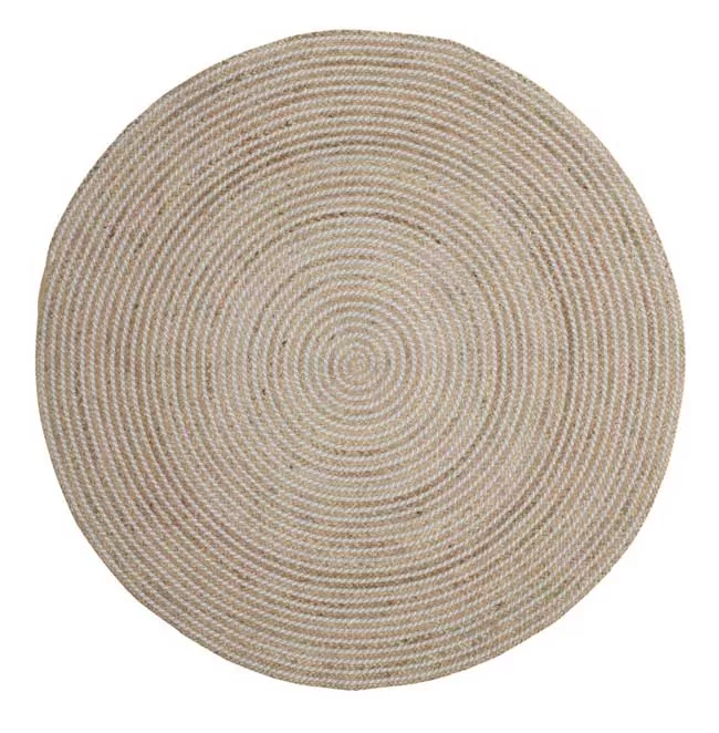 Okrugli tepih prečnika 120cm, izrašen od jute i pamuka, namenjen za korišćenje u zatvorenom prostoru.