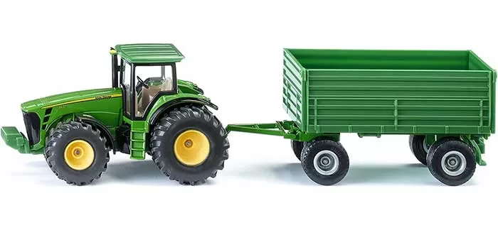 SIKU igračka traktor John Deere 8000 sa prikolicom je verni prikaz realne poljoprivredne mašine. Ovaj traktor ima kuku za prikolicu, prikolicu koja se otvara sa strane, okretne, gumirane točkove poljoprivrednog profila i može mu se skinuti kabina.