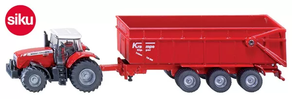 Moćan traktor sa 3-osovinskom, damper prikolicom. Iskipuj teret i kreni na novi zadatak. Model traktora je urađen po ugledu na Massey Ferguson traktor.