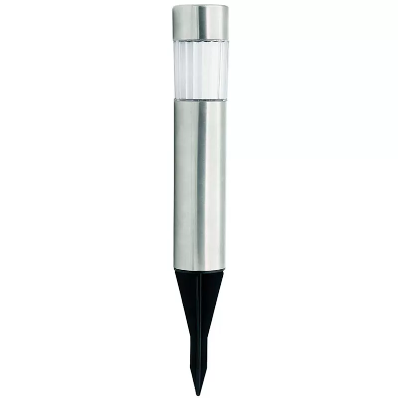 Ubodna, baštenska lampa sa solarnim napajanjem. Dimenzije lampe 33 x 4.7 x 4.7 cm. Solarni panel napaja bateriju od 100 mAh. Svetli belom svetlošću.