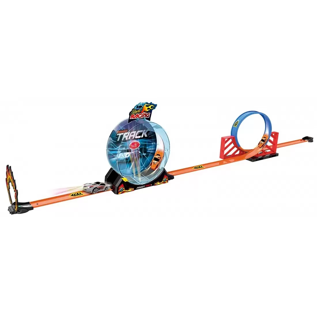 Odlična igra za ljubitelje staza, automobila i trka. Staza sa dva lupinga, ukupne dužine 198 cm i svetlosnim efektima. Auto na potezanje ima zvučne i svetlosne efekte.