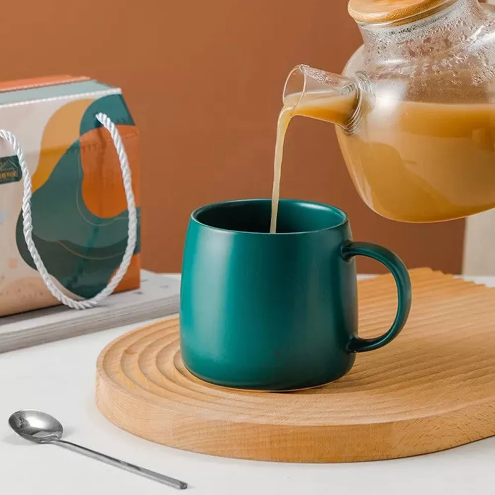 Velika keramička šolja u nordijskom stilu, sa matiranom površinom tamno zelene boje uz koju se dobija i kašičica srebrne boje.
