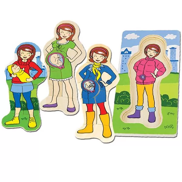 Četvoroslojna drvena slagalica koja sadrži postolje i 4 slagalice koje se ređaju jedna na drugu i slikom hronološki nadovezuju u prikazu procesa rađanja bebe.