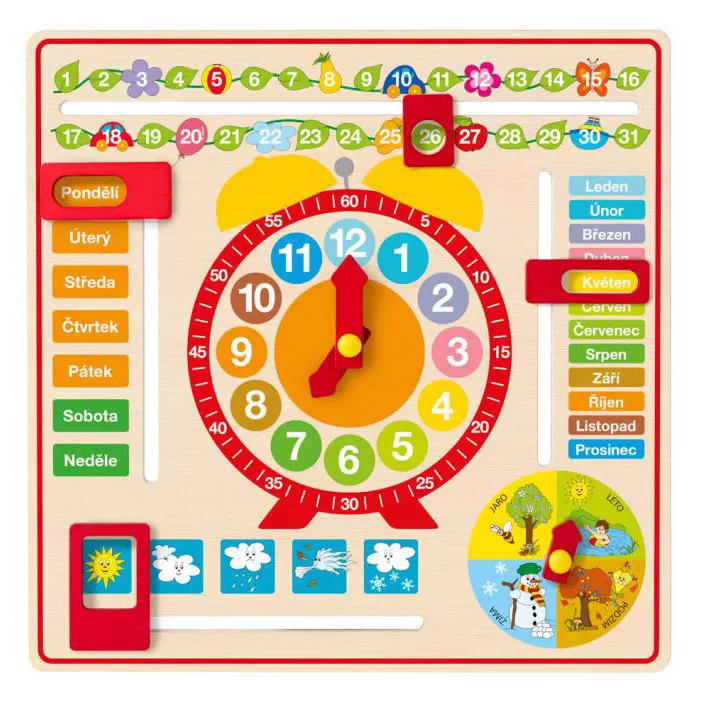 Kroz igru se lepše i lakše uči! Ovaj kalendar je namenjen da dete lako nauči da gleda na sat, kao i da razume pojmove dana, nedelje, meseca, godišnjeg doba, vremenskih prilika i njihovu povezanost.
