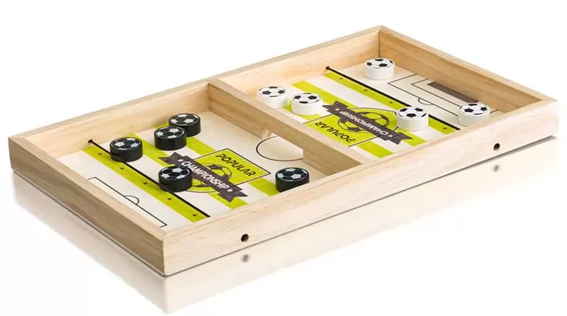 WOODY stoni fudbal je društvena igra spretnosti za dva igrača. Svaki igrač ima po 5 lopti i trudi se da ih pomoću lastiša prebaci na protivničku stranu kroz otvor na pregradi na sredini terena.