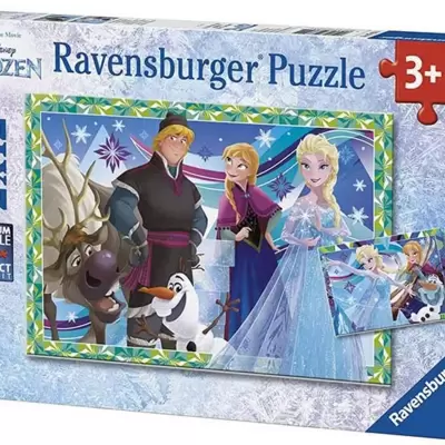 Dve slagalice u jednom pakovanju, a tema su junaci iz crtaća Frozen: Elza, Ana, Kristof, Olaf i irvas. Broj delova: 2 x 12. Uzrast: 3+.