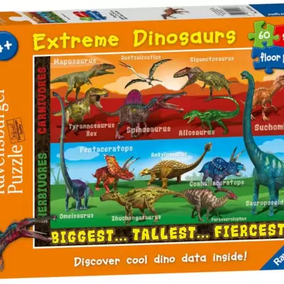 Velike podne puzzle sa motivom najopasnijih dinosaurusa! Dimenzije složene slagalice su 90 x 60 cm. Uzrast: 4+.