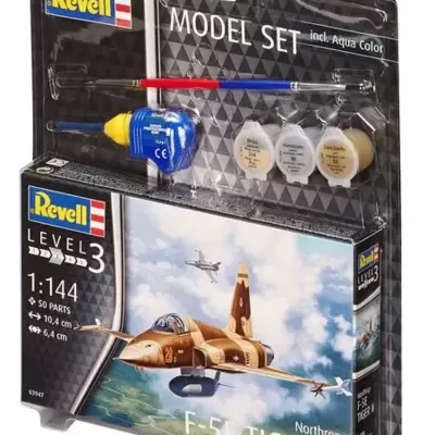 Maketa aviona F-5E Tiger II sa priborom za lepljenje i bojenje. Komplet sadrži 50 delova za sklapanje makete u razmeri 1:144.