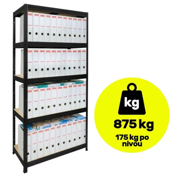 Unesite red u svoj prostor bez žrtvovanja stila. Ova mat crna polica nije samo praktično rešenje za skladištenje, već i upečatljiv komad nameštaja koji se savršeno uklapa u moderne enterijere, radionice ili „loft“ kancelarije. Sa dubinom od 45 cm i širinom od 90 cm, nudi ogroman prostor za odlaganje, dok kombinacija crnog čelika i toplog medijapana pruža profesionalan i robustan izgled. Bilo da je koristite za tešku opremu, izlaganje robe u lokalu ili kao modernu policu za knjige i dekoraciju, ovaj model garantuje stabilnost i izdržljivost. Elegantna Mat Crna završnica: Poseban premaz nije samo estetski privlačan, već pruža i dodatnu otpornost na ogrebotine i habanje, čineći policu dugovečnom i lakom za održavanje. Dubina od 45 cm: Povećana dubina omogućava skladištenje kabastijih predmeta, kutija sa alatom ili širih registratora koji ne staju na standardne police. Neverovatna snaga (875 kg ukupno): Svaki od 5 nivoa podnosi 175 kg tereta. To je ukupno skoro tona kapaciteta na jednoj polici! Podesivi nivoi: Zahvaljujući sistemu žlebova, visinu svake police određujete sami, bez potrebe za vijcima i komplikovanim montiranjem. Zbog velike visine ova polica ima visoko težište, stoga je fiksiranje za zid obavezno. Najteže stvari (alat, gume, tegle) uvek stavljajte na donje nivoe radi dodatne stabilnosti cele konstrukcije.