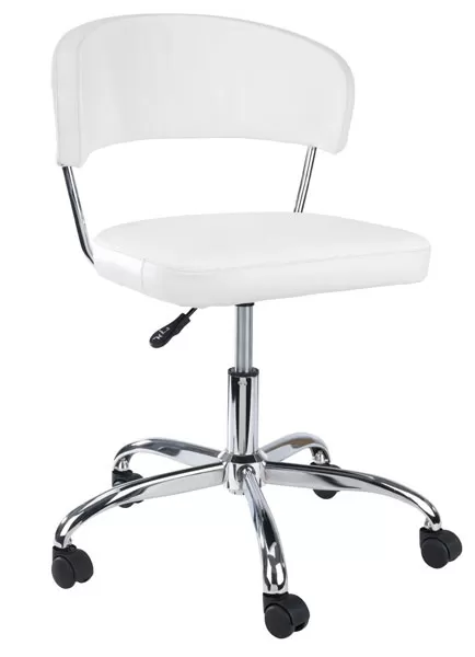 Udobna radna stolica presvučena belom veštačkom kožom. Ima mogućnost podešavanja visine i točkiće za lakše pozicioniranje i pronalaženje idealnog položaja tokom rada.