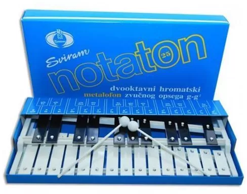 Školski dvoredni metalofon sa zvučnim opsegom g-g2. Isporučuje se sa udaraljkama.