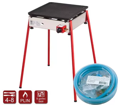Gorenc plinski roštilj sa nogarima, koji je pogodan za unutrašnju i spoljnu upotrebu. Ima rebrastu ploču i set za priključivanje u kome su crevo za plin i regulator.