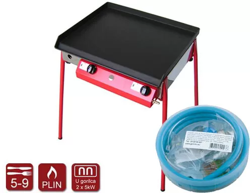 Gorenc plinski roštilj sa nogarima, koji je pogodan za unutrašnju i spoljnu upotrebu. Ima gvozdenu ploču dimenzija 51x40cm i komplet za priključivanje na plinsku bocu.