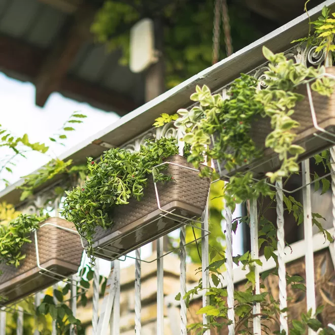 Komplet podrazumeva 5 žardinjera u braon boji i 5 žica u beloj boji