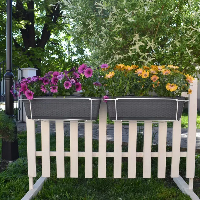 Komplet podrazumeva 5 žardinjera u sivoj boji i 5 žica u beloj boji