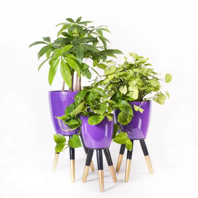 Drveni stalak zlatno-crni sa ljubičastom saksijom 30 cm