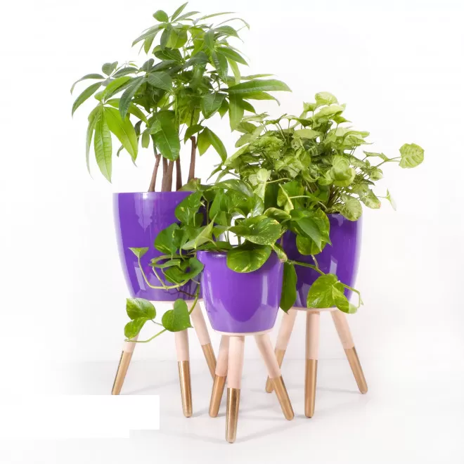 Drveni zlatno-beli stalak sa ljubičastom saksijom 20cm