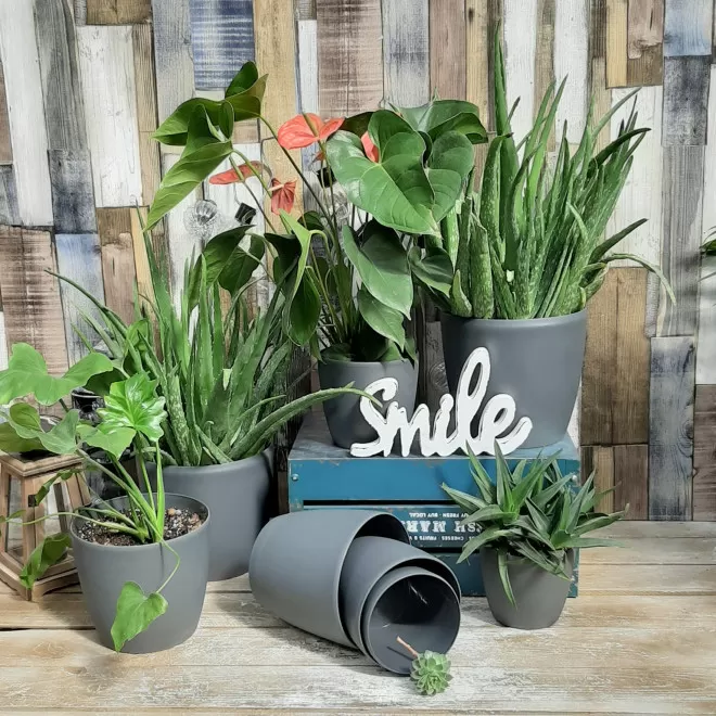 Komplet saksija u mat sivoj boji sa unutrašnjom tacnom 8 komada