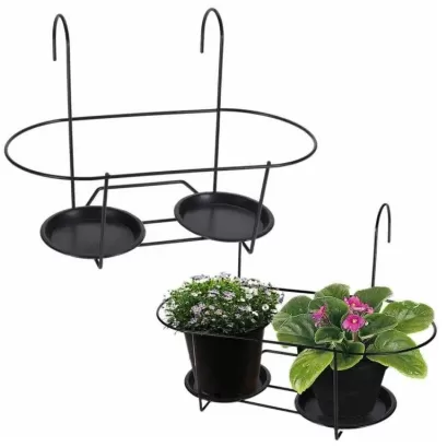 Metalni držač za dve saksije. Može da primi dve saksije čije je dno prečnika 10 cm. Držač se može okačiti na ogradu debljine do 5 cm.