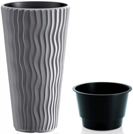 Visoka saksija Sandy slim, novi je proizvod kompanije Prosperplast. Interesantano dizajnirana, sa vertikalnim krivudavim linijama u prostoru izgleda veoma vitko i lepo čak i bez cveća. Prečnik u gornjem delu je 39 cm, a visina je 71 cm...