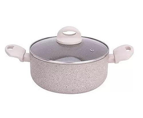 Šerpica sa specijalnim petoslojnim STONE LINE premazom i staklenim poklopcem. Soft touch ručke. Bez PFOA. Indukciono dno
