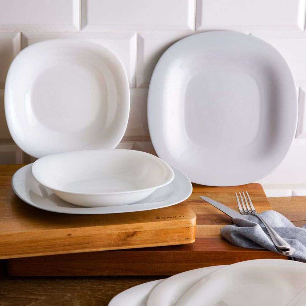 Carine set za ručavanje se sastoji od 18 delova 6 plitkih tanjira 27cm, 6 dubokih tanjira 21 cm i 6 dezertnih tanjira 19.5cm.