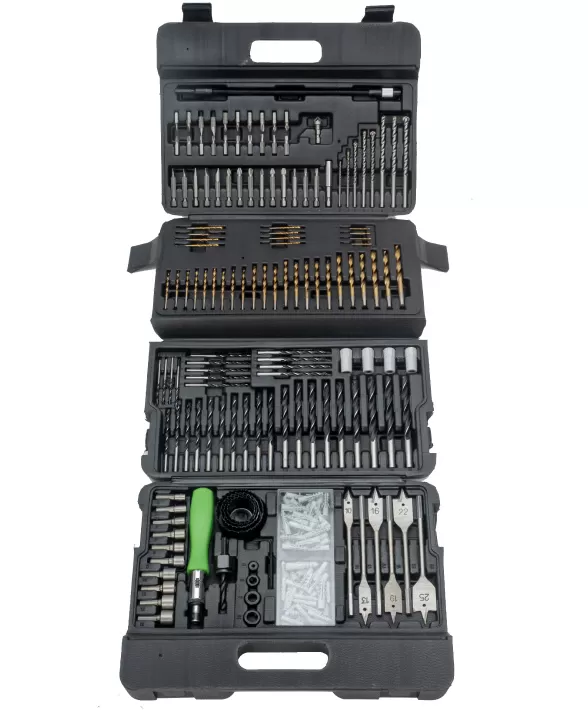 Set alata sadrži veliki izbor nastavaka i dodataka namenjenih za šrafljenje i bušenje, spakovanih u praktičan kofer za nošenje i odlaganje.