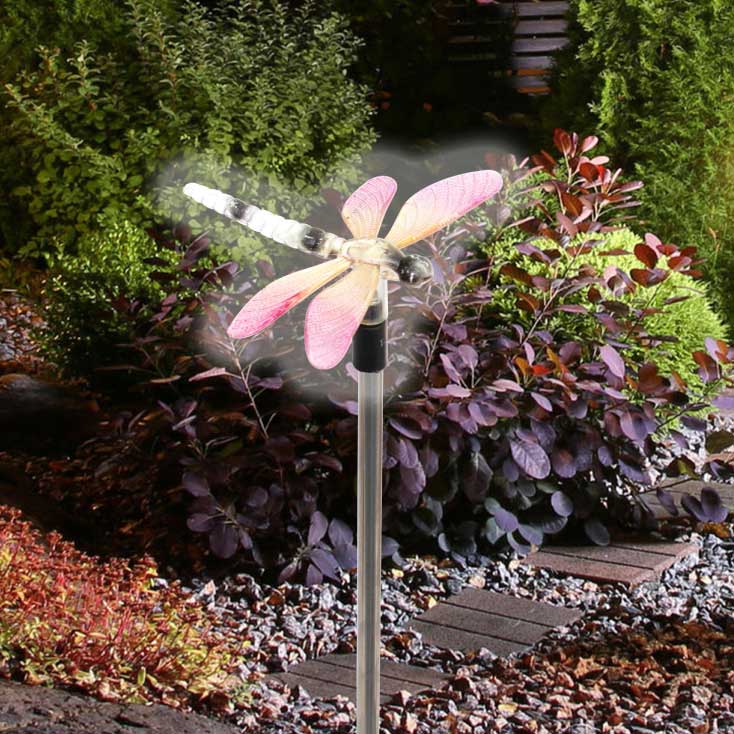 Solarna baštenska lampa u obliku vilinog konjica. Baterija od 600 mAh obezbeđuje dug neprestani rad noću, i do 8 h, a dopunjava se preko dana.