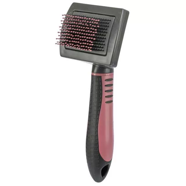 Četka sa plastičnim zupcima zaobljenog vrha i plastičnom, gumiranom drškom namenjena je za negu krzna i potkrzna kod pasa, mačaka, kunića i drugih ljubimaca koji imaju krzno kratke i ravne dlake.