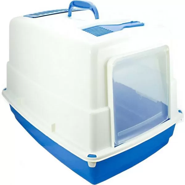 Zatvoreni toalet za mačke, 54x39x39cm, sa pokretnim vratancima, tako da je smanjeno izbacivanje posipa prilikom zatrpavanja. Ima filter protiv širenja neprijatnih mirisa i lopaticu za čišćenje.