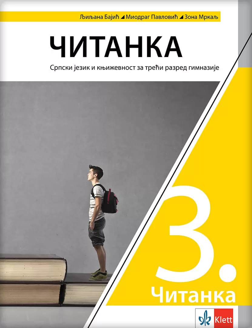 Čitanka za srpski jezik i književnost za treći razred gimnazije, izdavač Klett. Autor: Zona Mrkalj, Ljiljana Bajić, Miodrag Pavlović.