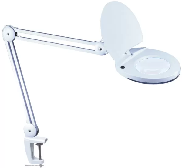 Stona lampa sa LED osvetljenjem i lupom koja uveličava 2.25x. Na radni sto se montira pomoću ugrađene stege i odgovara raznim modelima stolova raznih debljina radne ploče.