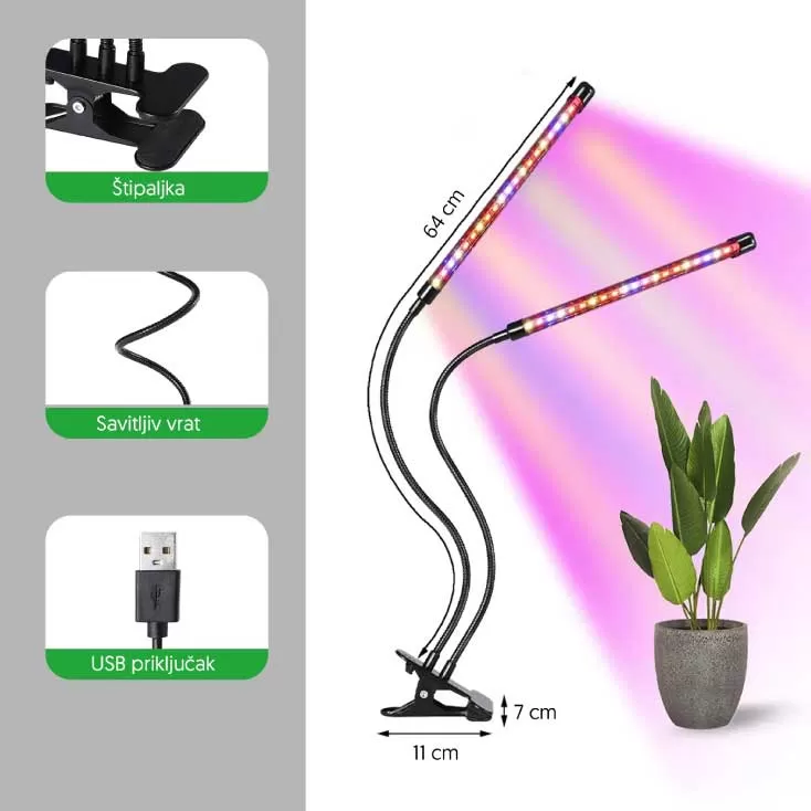 Stona USB lampa namenjena za rast i razvoj sobnih biljki. Dizajnirana je da pruži optimalno LED osvetljenje za sobne biljke. Ima 2 kraka što je čini pogodnom za osvetljavanje više biljaka. Savitljiv vrat omogućava usmeravanje svetlosti prema biljkama pod