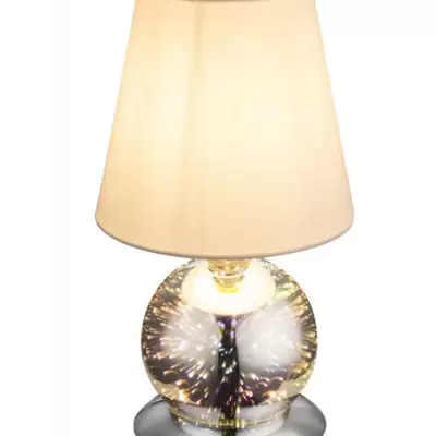 Ova jedinstvena stona lampa kombinuje dizajn i tradiciju. Postolje ove 26cm visoke stone lampe je izrađeno od modernog hromiranog stakla sa 3D...