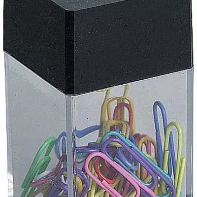Uglasta magnetna kutija za spajalice sa spajalicama u boji, providna sa crnim poklopcem dimenzija 42 x 42 x 70 mm.