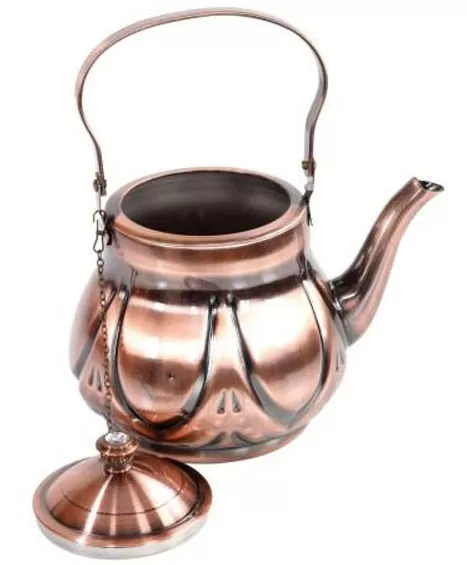 Čajnik sa poklopcem, zapremine 1.8 litara. Čajnik je izrađen u retro stilu, obložen je bakrom, a poklopac je ukrasnim lancem vezan za samu posudu.