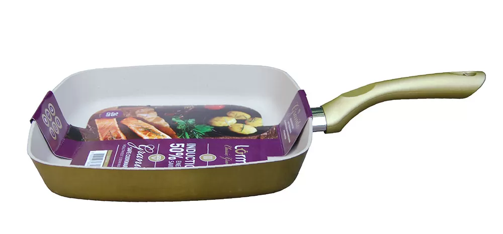 Klasičan Gril tiganj od granita sa nelepljivom površinom. Jednaka distribucija toplote, ručka od bakelita. Otporan na grebanje. Može se prati u sudo-mašini. Koristi se na električnim i plinskim šporetima.