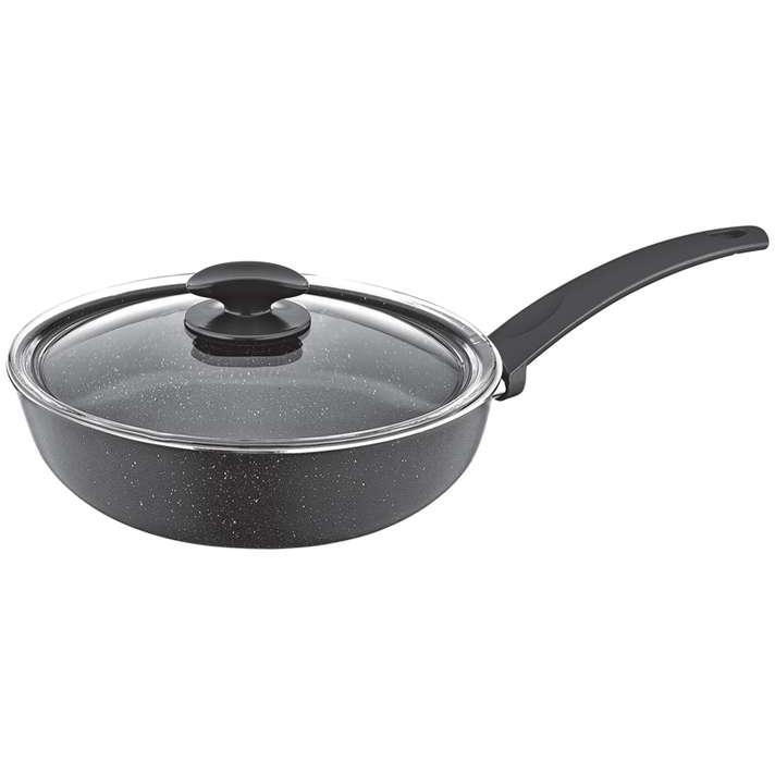 Kuhinjski tiganj prečnika 24cm, izrađen od aluminijuma. Unutrašnjost je presvučena posebnim slojem koji sprečava lepljenje hrane. Dolazi sa staklenim poklopcem.