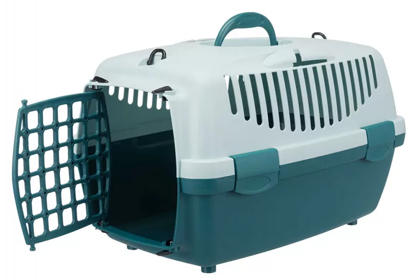 Kutija od livene plastike sa rešetkastim vratancima i ventilacijom, namenjena je za transport kućnih ljubimaca mase do 6kg i koji mogu stati u prostor dimenzija 32x31x48cm.