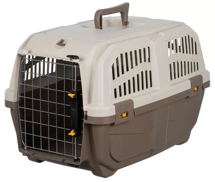 Kutija od livene plastike sa žičanim vratancima i bravom, namenjena je transportu kućnih ljubimaca mase do 12kg i koji mogu stati u prostor dimenzija 30x32x49cm. Ima ručku za nošenje.