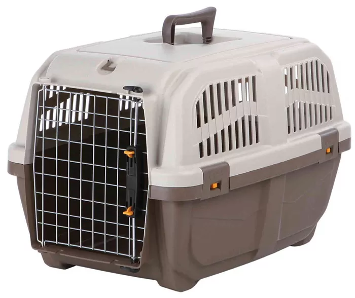 Kutija od livene plastike sa žičanim vratancima i bravom, namenjena je transportu kućnih ljubimaca mase do 24kg i koji mogu stati u prostor dimenzija 40x39x60cm. Ima ručku za nošenje.