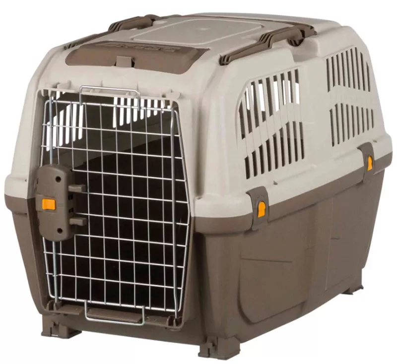 Kutija od livene plastike sa žičanim vratancima i bravom, namenjena je transportu kućnih ljubimaca mase do 30kg i koji mogu stati u prostor dimenzija 48x51x68cm.