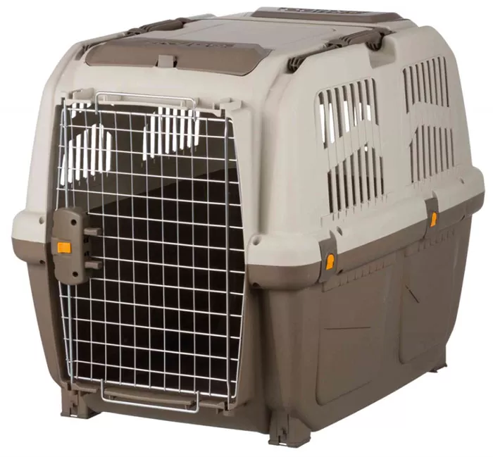 Kutija od livene plastike sa žičanim vratancima i bravom, namenjena je transportu kućnih ljubimaca mase do 40kg i koji mogu stati u prostor dimenzija 63x70x92cm.