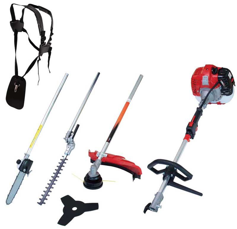 Mulifunkcionalni motorni trimer se može koristiti za košenje travnjaka, šišanje živih ograda ili sečenje tanjih grana stabala. Isporučuje se sa remenom za nošenje.
