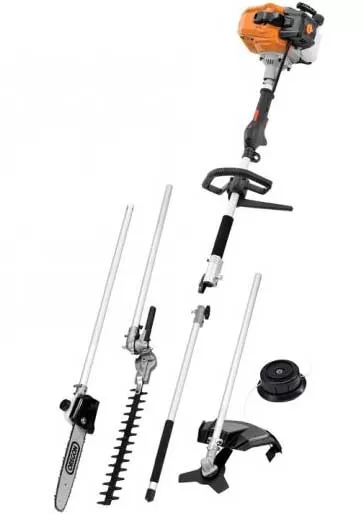 Multifunkcionalni alat neophodan svakom dvorištu i bašti. Sjajan uređaj koji u sebi objedinjuje trimer za travu (sa strunom i nožem), teleskopski trimer za živu ogradu i teleskopsku testeru za grane.