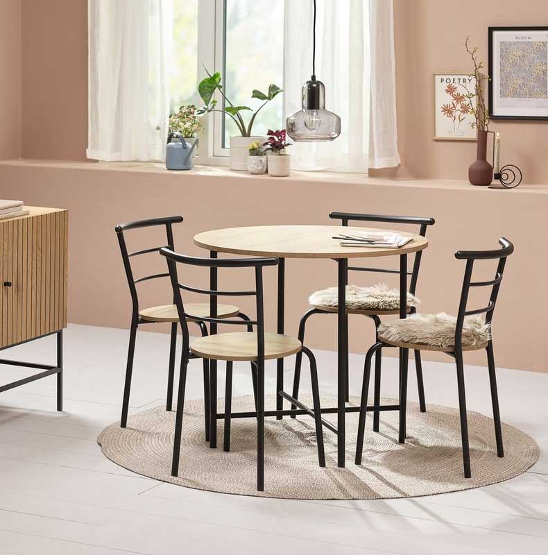 Kompaktna i praktična trpezarijska garnitura, idealna za manje prostorije. Garnituru čine sto sa okruglom pločom i četiri lagane stolice.