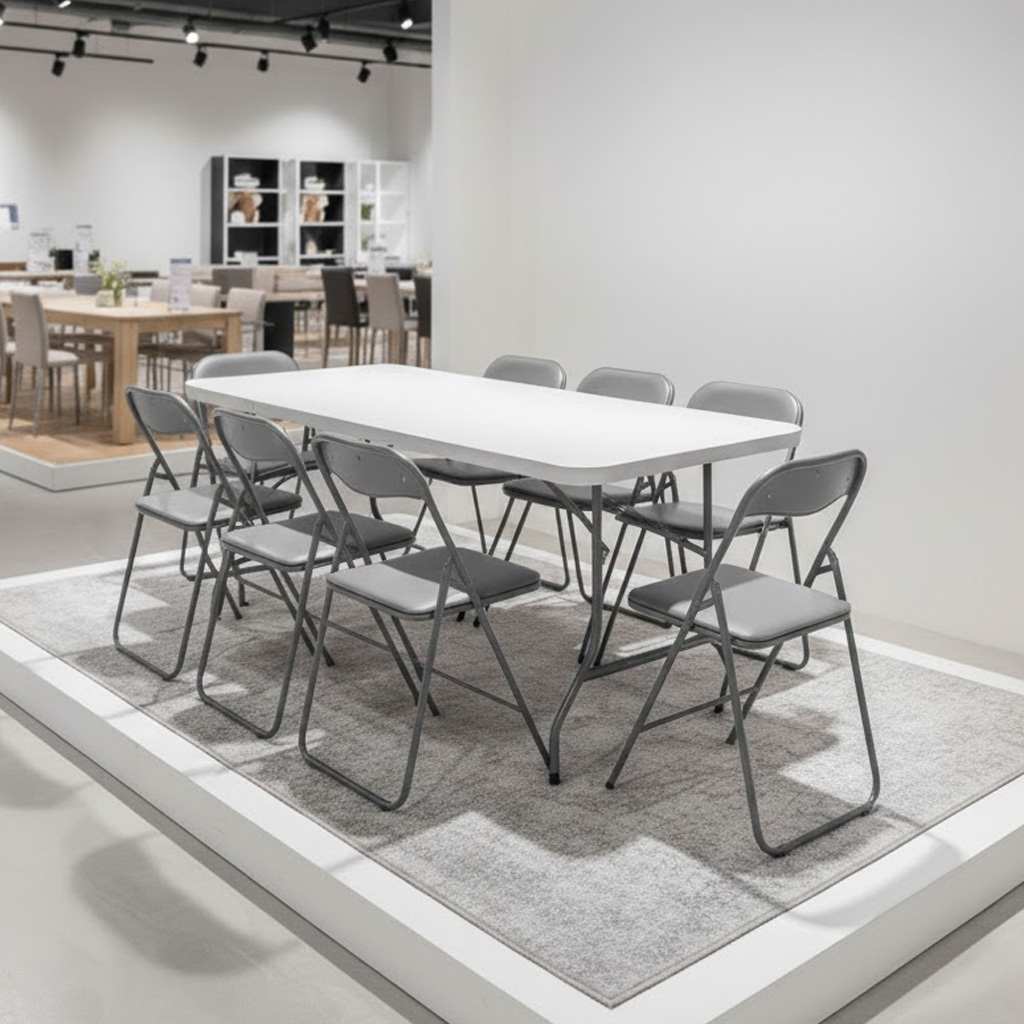 Garnitura za 8 osoba, pogodna za slave, rođendane i druge povode za okupljanja kada vam je potrebno nekoliko mesta više. Stolice i sto koji čine garnituru su potpuno sklopivi, što ih čini neverovatno lakim za odlaganje jer zauzimaju jako malo mesta.
