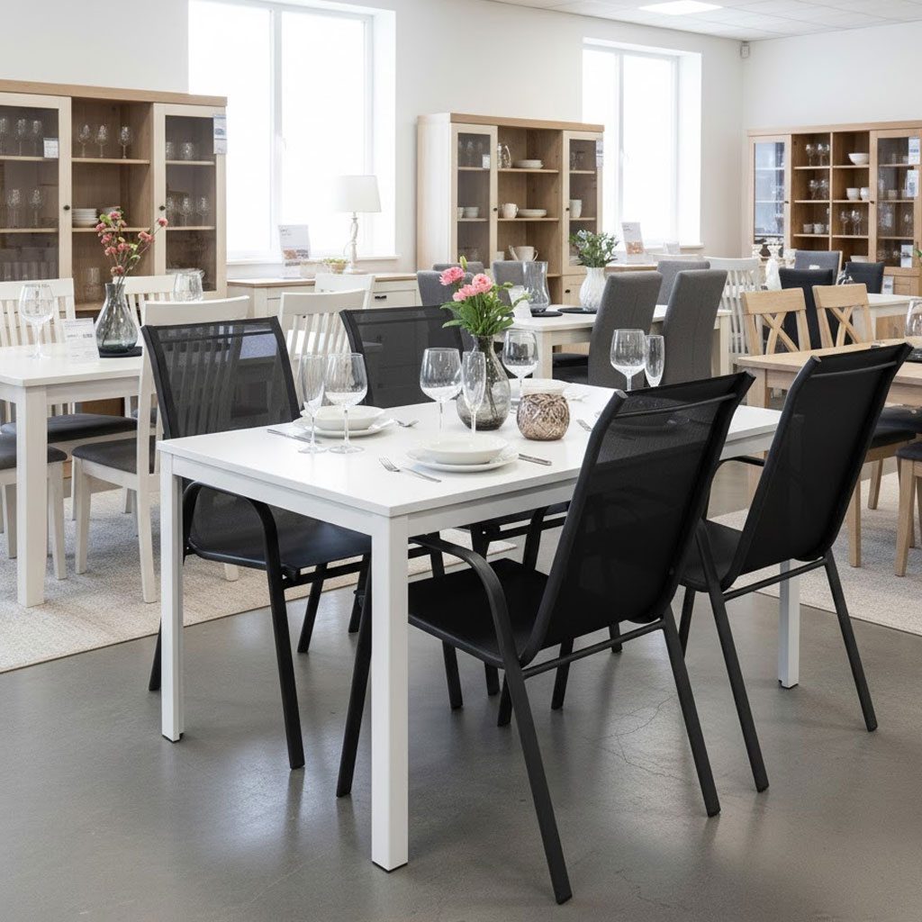 Unesite stil i funkcionalnost u svoju trpezariju sa našom modernom trpezarijskom garniturom koja se sastoji od jednog stola i četiri stolice. Kombinacija elegantnog belog stola i modernih crnih stolica stvara vizuelno privlačan i savremen izgled.